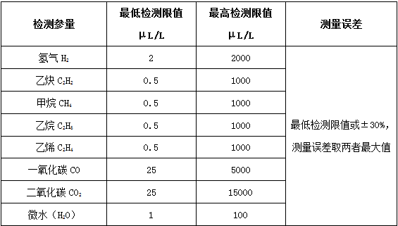 監測變壓器、電抗器等充油高壓電氣設備絕緣油中的氫氣(H2)、一氧化碳(CO)、甲烷(CH4)、乙炔(C2H2)、乙烯(C2H4)、乙烷(C2H6)、二氧化碳(CO2)、微水(H2O,可選)及總烴、總可燃氣體含量等,并實(shí)時(shí)分析、診斷變壓器/電抗器等的運行狀態(tài)。